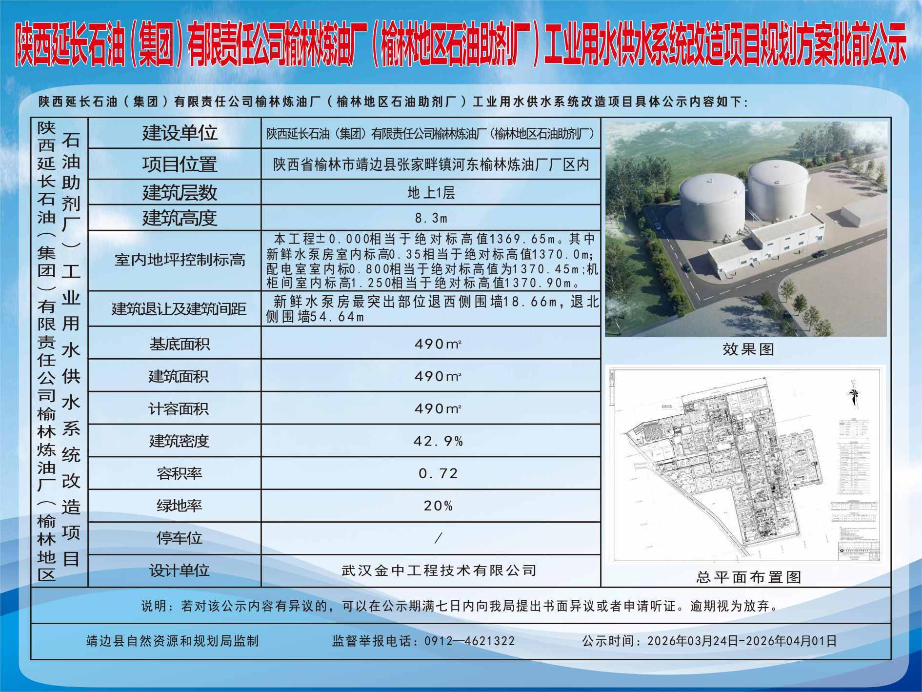 建设内容:拟建3处建构筑物:地上1层新鲜水泵房(含配电室、机柜间),建筑面积490㎡,计容面积490㎡;2×10000㎡钢制储水罐,占地面积1347.88㎡,计容面积2551.76㎡。原有建筑面积180885.70㎡、原有计容面积212806.70㎡。新建后总建筑面积181375㎡、总计容面积215848.46㎡。主要技术经济指标为建筑系数42.9%(≥30%),容积率0.72(≥0.5),绿地率20%(≤20%)。